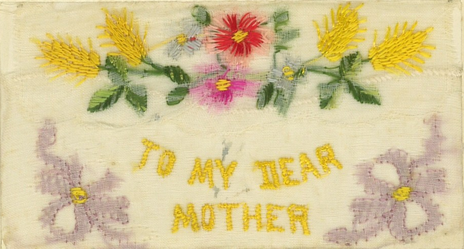 I was recently contacted by Noelle McArthur who lives in Melbourne with her husband Tony. Noelle and Tony have silk embroidered cards Gordon Iles sent from the western front to his family in Tasmania. Their daughter, Anita, scanned the cards for me. I’m posting the scanned cards to mark Mothers Day because two of the cards are to Gordon’s mother, Margaret.